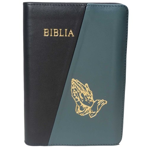Biblie din piele, marime medie, culoare negru verde închis , simbol maini in rugaciune, fermoar, index, margini aurii, cuv. lui Isus cu rosu [SB 057 PFI]