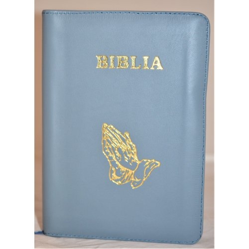 Biblie din piele, marime medie, culoare nuanta albastru celadon, simbol maini in rugaciune, fermoar, index, margini aurii, [SB 057 PFI]