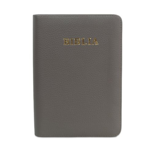 Biblie din piele, marime medie, culoare nuanta de gri, fermoar, margini albe,cuv. lui Isus cu rosu [053]