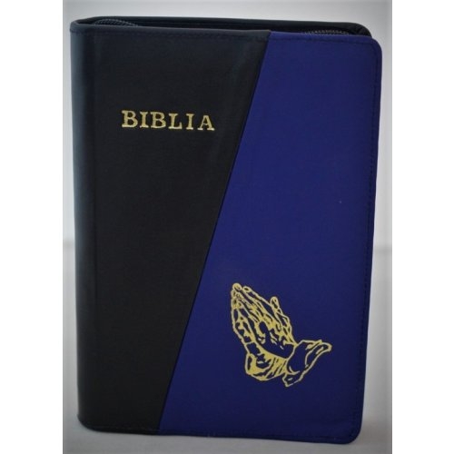 Biblie din piele, marime medie, culoare nuanta negru,albastru simbol maini in rugaciune, fermoar, index, margini aurii, cuv. lui Isus cu rosu [SB 057 PFI]