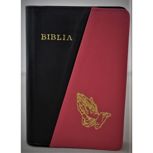 Biblie din piele, marime medie, culoare nuanta negru,roz simbol maini in rugaciune, fermoar, index, margini aurii, cuv. lui Isus cu rosu [SB 057 PFI]
