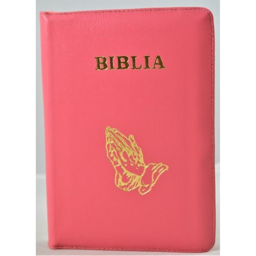 Biblie din piele, marime medie, culoare nuanta roz, simbol maini in rugaciune, fermoar, index, margini aurii, [SB 057 PFI]
