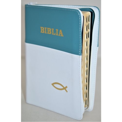 Biblie din piele, marime medie, culoare nuanta verde marin cu alb, simbol peste, fermoar, index, margini aurii, cuv. lui Isus cu rosu [SB 057 PFI]