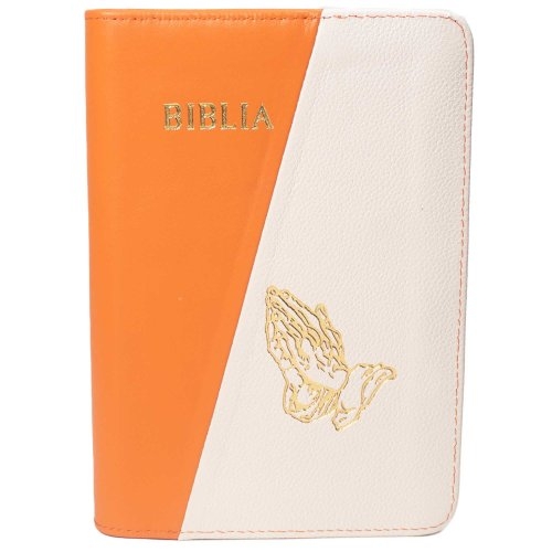 Biblie din piele, marime medie, culoare portocaliu cu crem, simbol maini in rugaciune, fermoar, index, margini aurii, cuv. lui Isus cu rosu [SB 057 PFI]