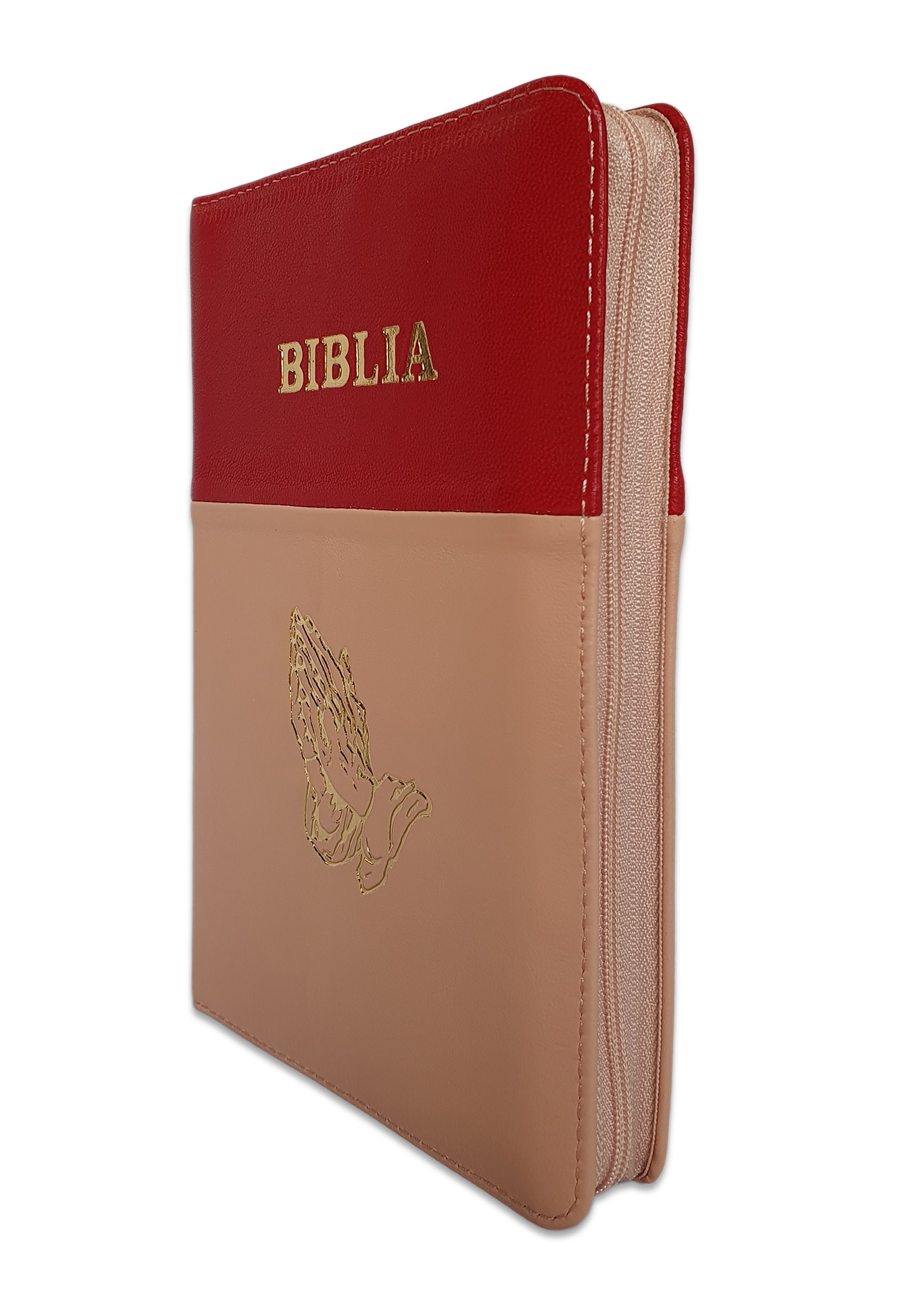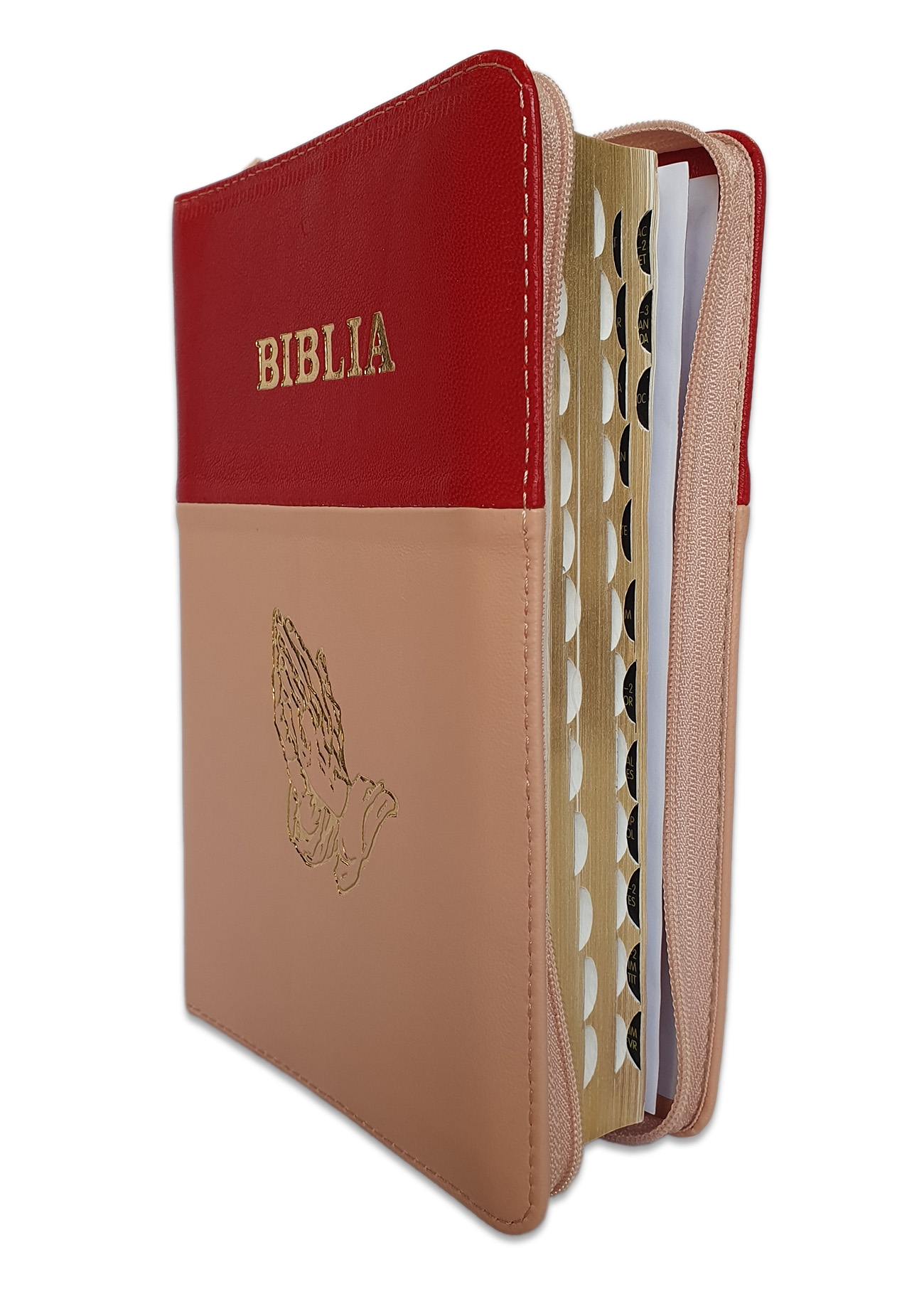 Biblie din piele, marime medie, culoare rosu cu cafeniu, simbol maini in rugaciune, fermoar, index, margini aurii, cuv. lui Isus cu rosu [SB 057 PFI]