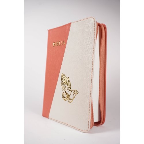 Biblie din piele, marime medie, culoare, roz coral cu crem, fermoar, margini albe, simbol maini in rugaciune cuv. lui Isus cu rosu [053]
