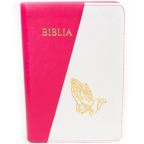 Biblie din piele, marime medie, culoare, roz cu alb, simbol maini in rugaciune, fermoar, index, margini aurii, cuv. lui Isus cu rosu [SB 057 PFI]