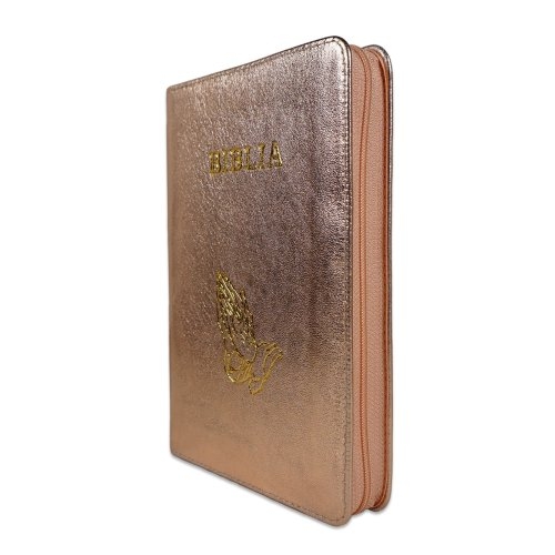 Biblie din piele, marime medie, culoare roz pal sidefat, simbol maini in rugaciune, fermoar, index, margini aurii, cuv. lui Isus cu rosu [SB 057 PFI]