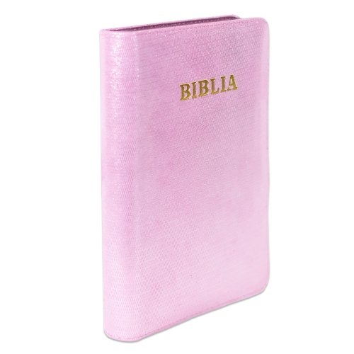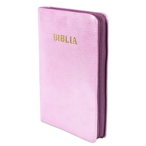 Biblie din piele, marime medie, culoare roz sidefat , fermoar, margini albe,cuv. lui Isus cu rosu [053]