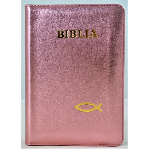 Biblie din piele, marime medie, culoare roz sidefat, simbol peste, fermoar, index, margini aurii, cuv. lui Isus cu rosu [SB 057 PFI]