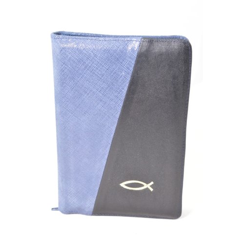 Biblie din piele, marime medie, culoare textura bleumarin/negru, simbol peste, fermoar, index, margini aurii, cuv. lui Isus cu rosu [SB 057 PFI]