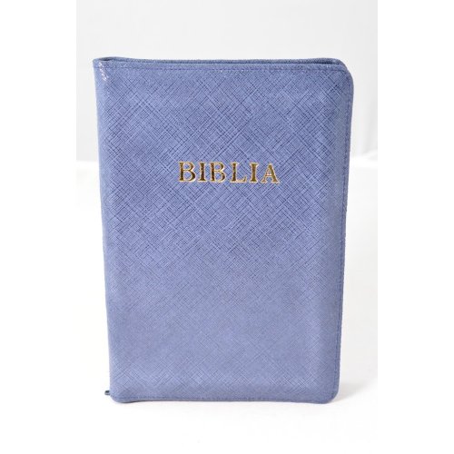 Biblie din piele, marime medie, culoare textura bleumarin, simpla, fermoar, index, margini aurii, cuv. lui Isus cu rosu [SB 057 PFI]