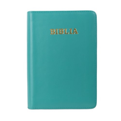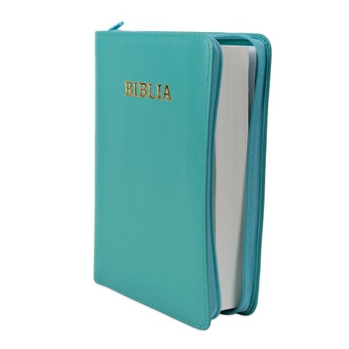 Biblie din piele, marime medie, culoare turcoaz deschis, fermoar, margini albe,cuv. lui Isus cu rosu [053]