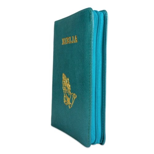Biblie din piele, marime medie, culoare turcoaz metalizat, simbol maini in rugaciune, fermoar, index, margini aurii, cuv. lui Isus cu rosu [SB 057 PFI]