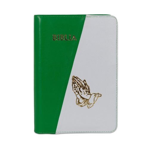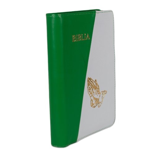 Biblie din piele, marime medie, culoare verde cu alb, simbol maini in rugaciune, fermoar, index, margini aurii, cuv. lui Isus cu rosu [SB 057 PFI]