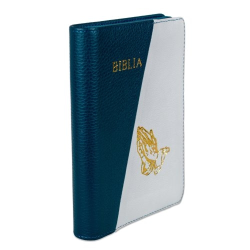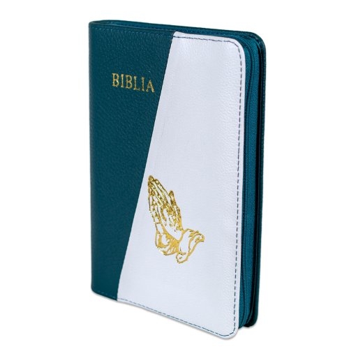Biblie din piele, marime medie, culoare verde inchis cu alb, simbol maini in rugaciune, fermoar, index, margini aurii, cuv. lui Isus cu rosu [SB 057 PFI]