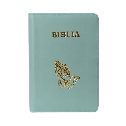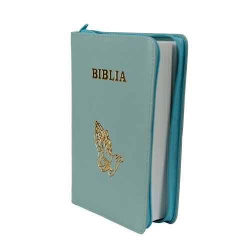 Biblie din piele, marime medie, culoare, verde mentă deschis, fermoar, margini albe, simbol maini in rugaciune, cuv. lui Isus cu rosu [053]