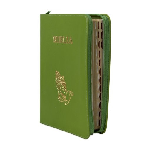 Biblie din piele, marime medie, culoare, verde oliv, simbol maini in rugaciune, fermoar, index, margini aurii, cuv. lui Isus cu rosu [SB 057 PFI]