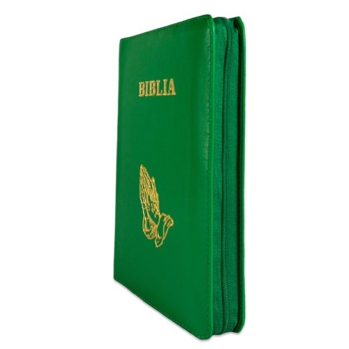 Biblie din piele, marime medie, culoare verde, simbol maini in rugaciune, fermoar, index, margini aurii, cuv. lui Isus cu rosu [SB 057 PFI]