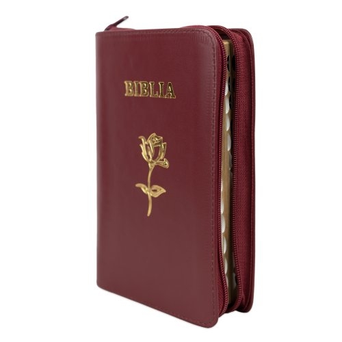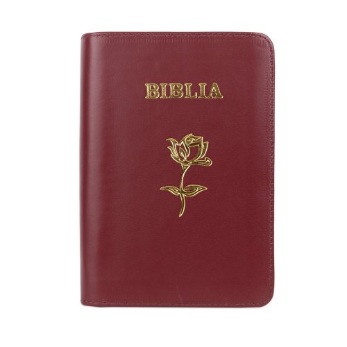 Biblie din piele, marime medie, culoare, vișiniu închis, simbol floral, fermoar, index, margini aurii, cuv. lui Isus cu rosu [SB 057 PFI]