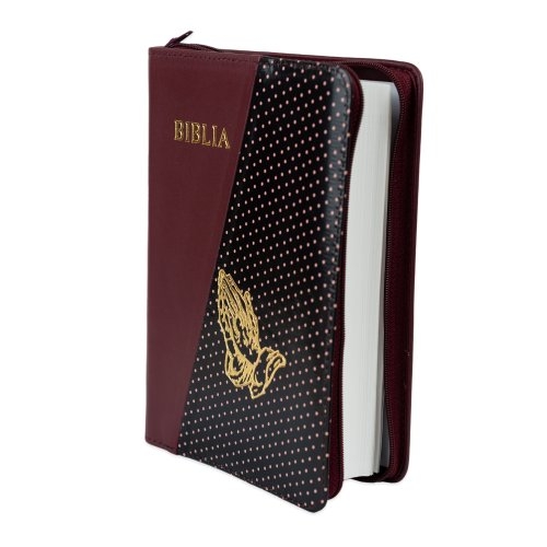 Biblie din piele, marime medie, culoare, vișiniu / negru cu puncte roz, fermoar, margini albe, simbol maini in rugaciune, cuv. lui Isus cu rosu [053]