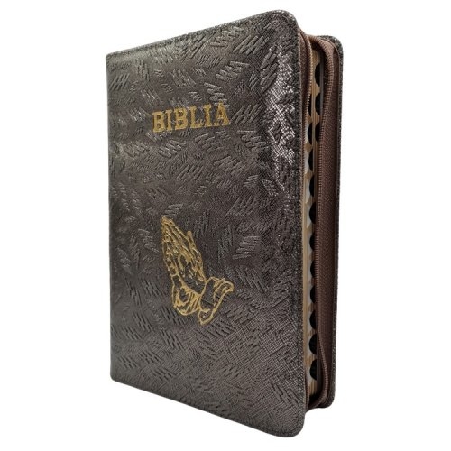 Biblie din piele, marime medie, gri texturat, simbol maini in rugaciune, fermoar, index, margini aurii, cuv. lui Isus cu rosu [SB 057 PFI]