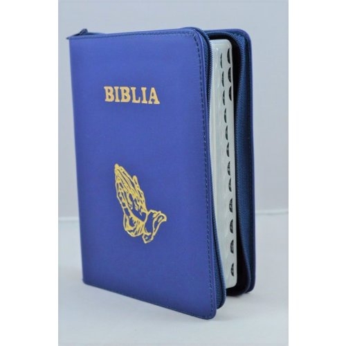 Biblie din piele, marime medie,culoare indigo, fermoar, index,simbol maini in ruga margini aurii, cuv. lui Isus cu rosu [SB 057 PFI]