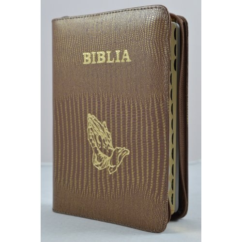 Biblie din piele, marime medie, maro auriu, simbol maini in rugaciune, fermoar, index, margini aurii, cuv. lui Isus cu rosu [SB 057 PFI]
