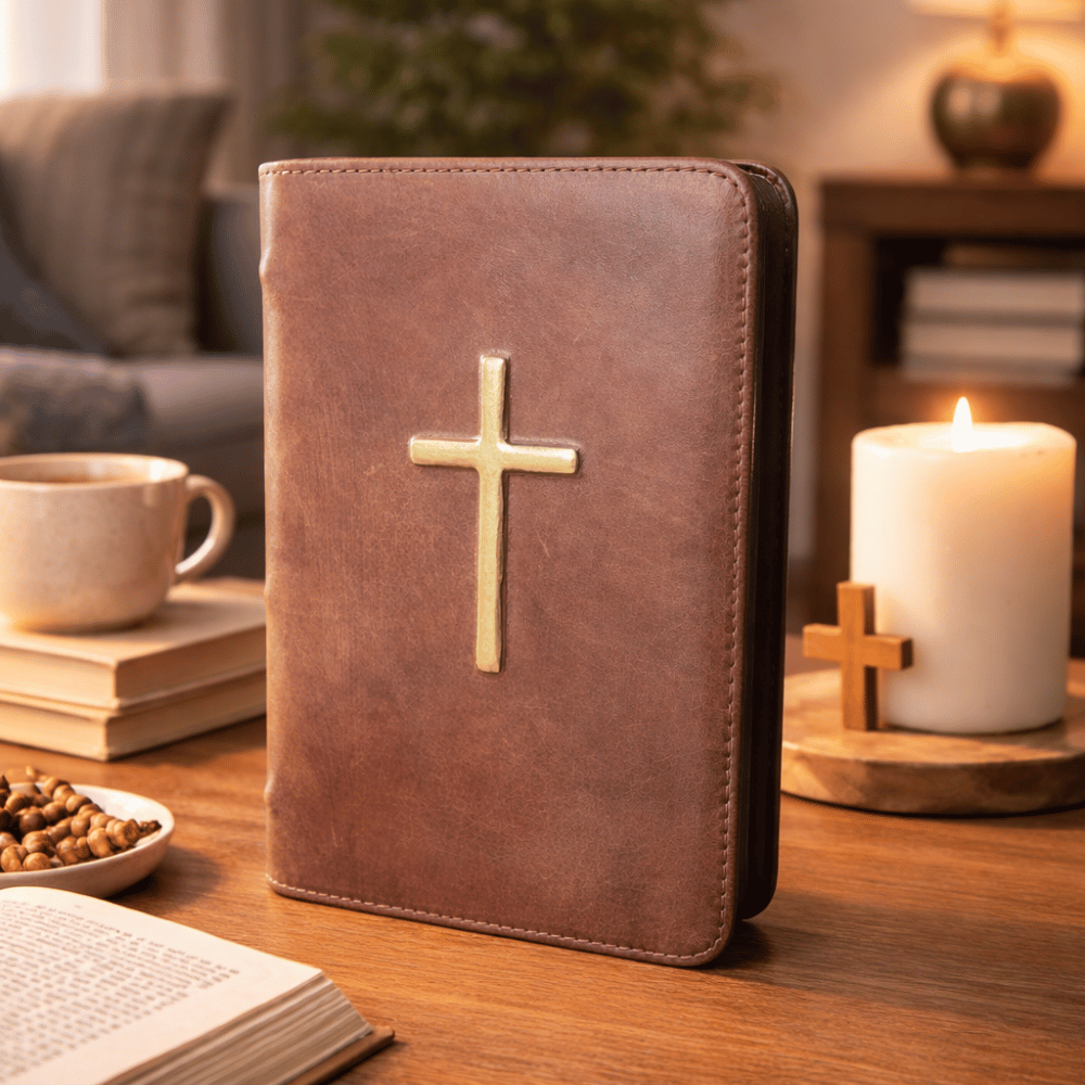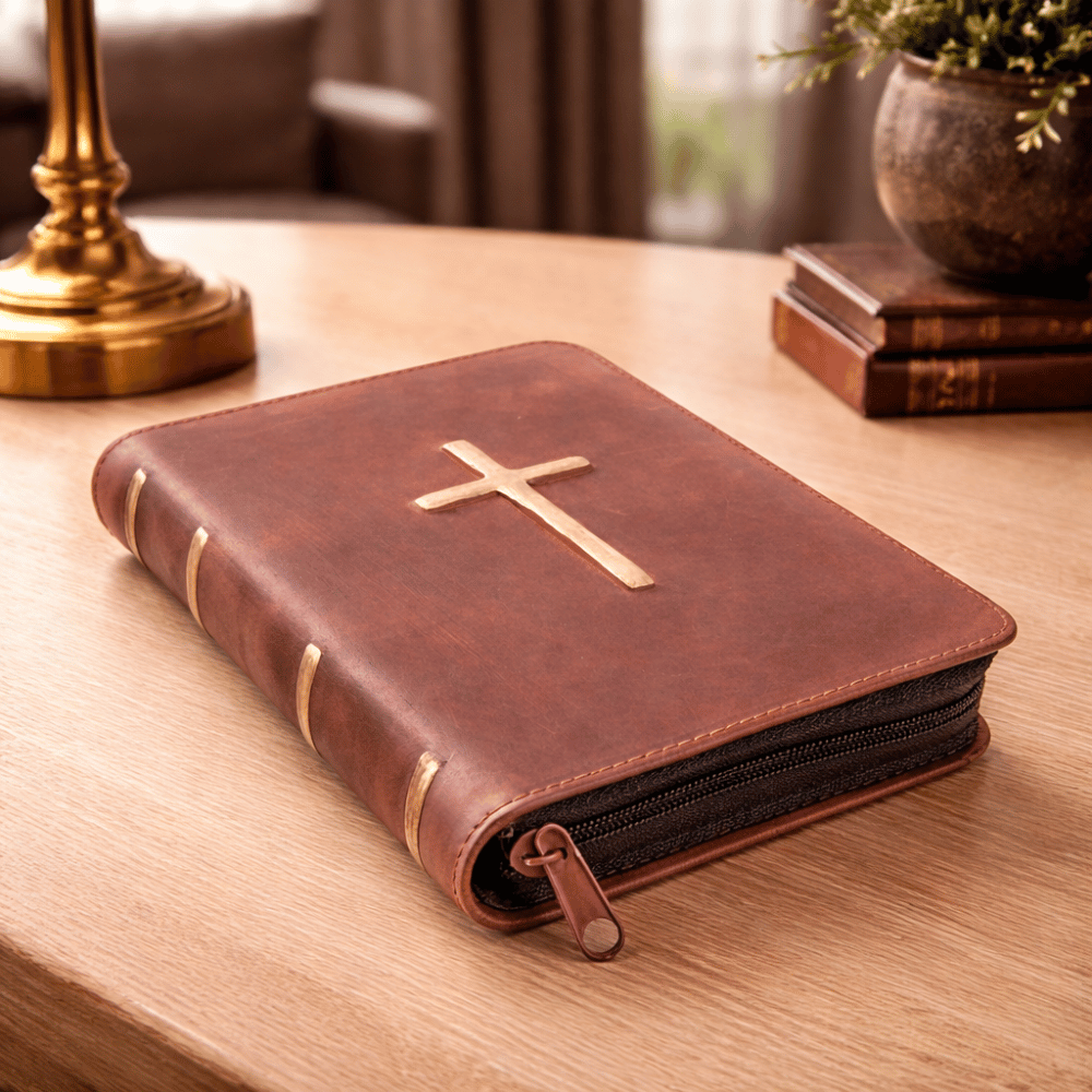 Biblie din piele, marime medie, maro marmorat, simbol cruce in relief, fermoar, index, margini aurii, cuv. lui Isus cu rosu [057 PFI]