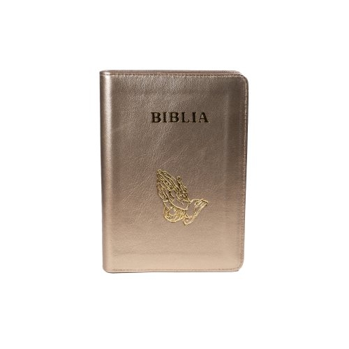 Biblie din piele, marime medie, maro sidefat, simbol maini in rugaciune, fermoar, index, margini aurii, cuv. lui Isus cu rosu [SB 057 PFI]