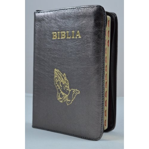 Biblie din piele, marime medie, neagra sidefata, simbol maini in rugaciune, fermoar, index, margini aurii, cuv. lui Isus cu rosu [SB 057 PFI]