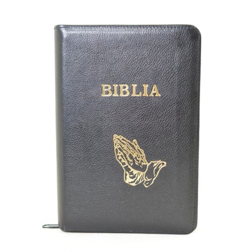 Biblie din piele, marime medie, neagra, simbol maini in rugaciune, fermoar, index, margini aurii, cuv. lui Isus cu rosu [SB 057 PFI]