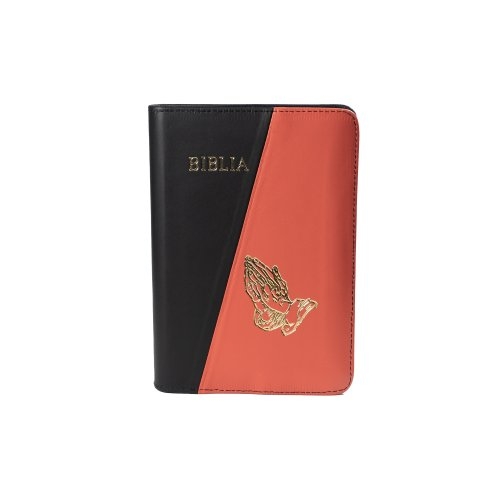 Biblie din piele, marime medie, negru cu cărămiziu , simbol maini in rugaciune, fermoar, index, margini aurii, cuv. lui Isus cu rosu [SB 057 PFI]