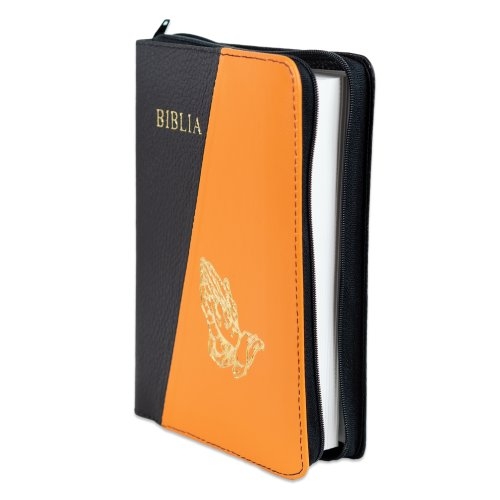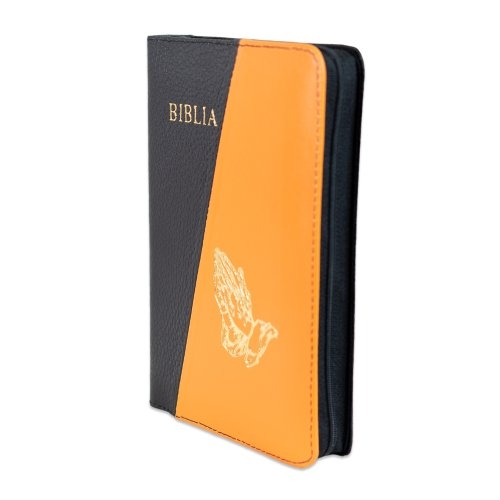 Biblie din piele, marime medie, negru cu portocaliu, fermoar, margini albe, simbol maini in rugaciune, cuv. lui Isus cu rosu [053]