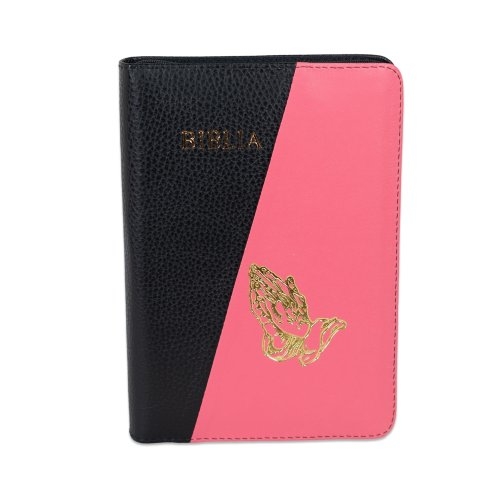 Biblie din piele, marime medie, negru cu roz coral, fermoar, margini albe, simbol maini in rugaciune, cuv. lui Isus cu rosu [053]