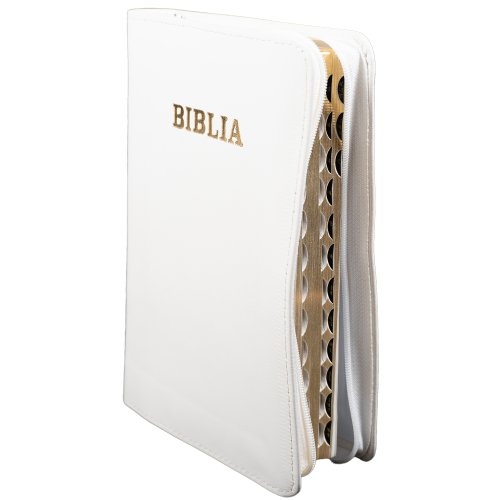 Biblie din piele, marime medie, alb murdar, fermoar, index, margini aurii, cuv. lui Isus cu rosu [SB 057 PFI]