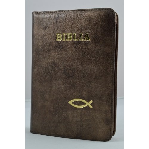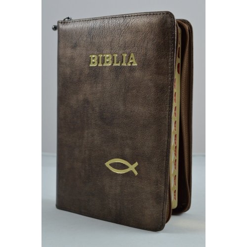 Biblie din piele, marime medie,nuanta de maro cu peste, fermoar, index, margini aurii, cuv. lui Isus cu rosu [SB 057 PFI]