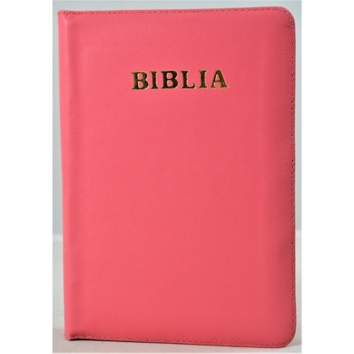 Biblie din piele, marime medie, nuanta roz, fermoar, index, margini aurii, cuv. lui Isus cu rosu [SB 057 PFI]