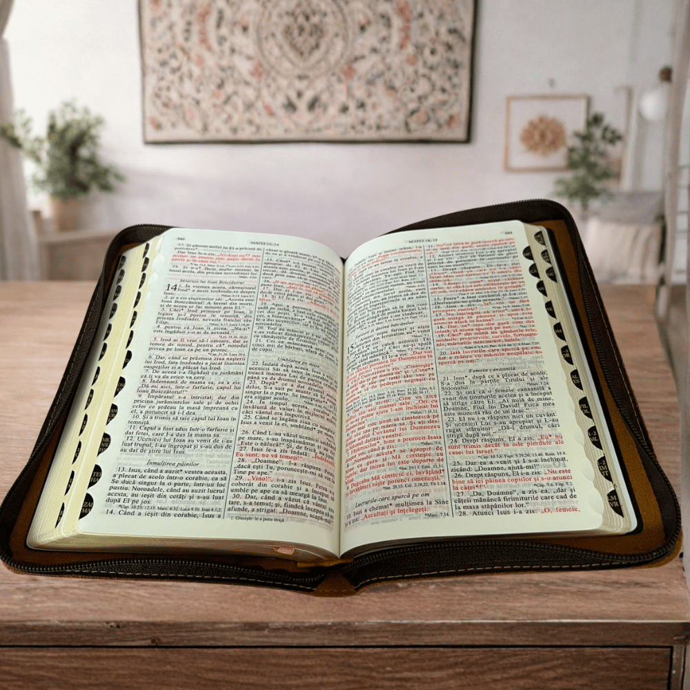 Biblie din piele, marime medie, portocalie, simbol cruce imprimat, fermoar, index, margini aurii, cuv. lui Isus cu rosu [057 PFI]