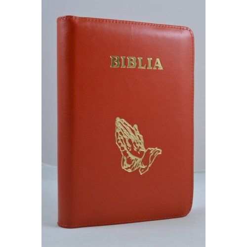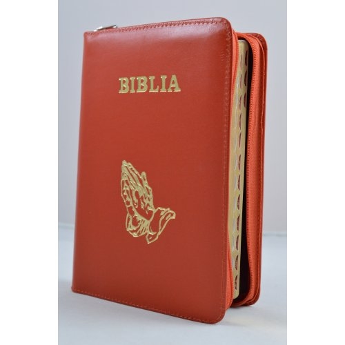 Biblie din piele, marime medie,rosu cu maini, fermoar, index, margini aurii, cuv. lui Isus cu rosu [SB 057 PFI]