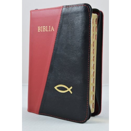 Biblie din piele, marime medie, rosu cu negru, simbol peste, fermoar, index, margini aurii, cuv. lui Isus cu rosu [SB 057 PFI]