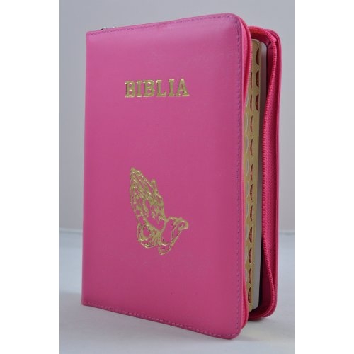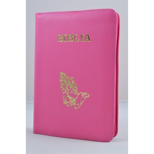 Biblie din piele, marime medie, roz bombon, maini in rugaciune, fermoar, index, margini aurii, harti biblice [SI 057 PFI]