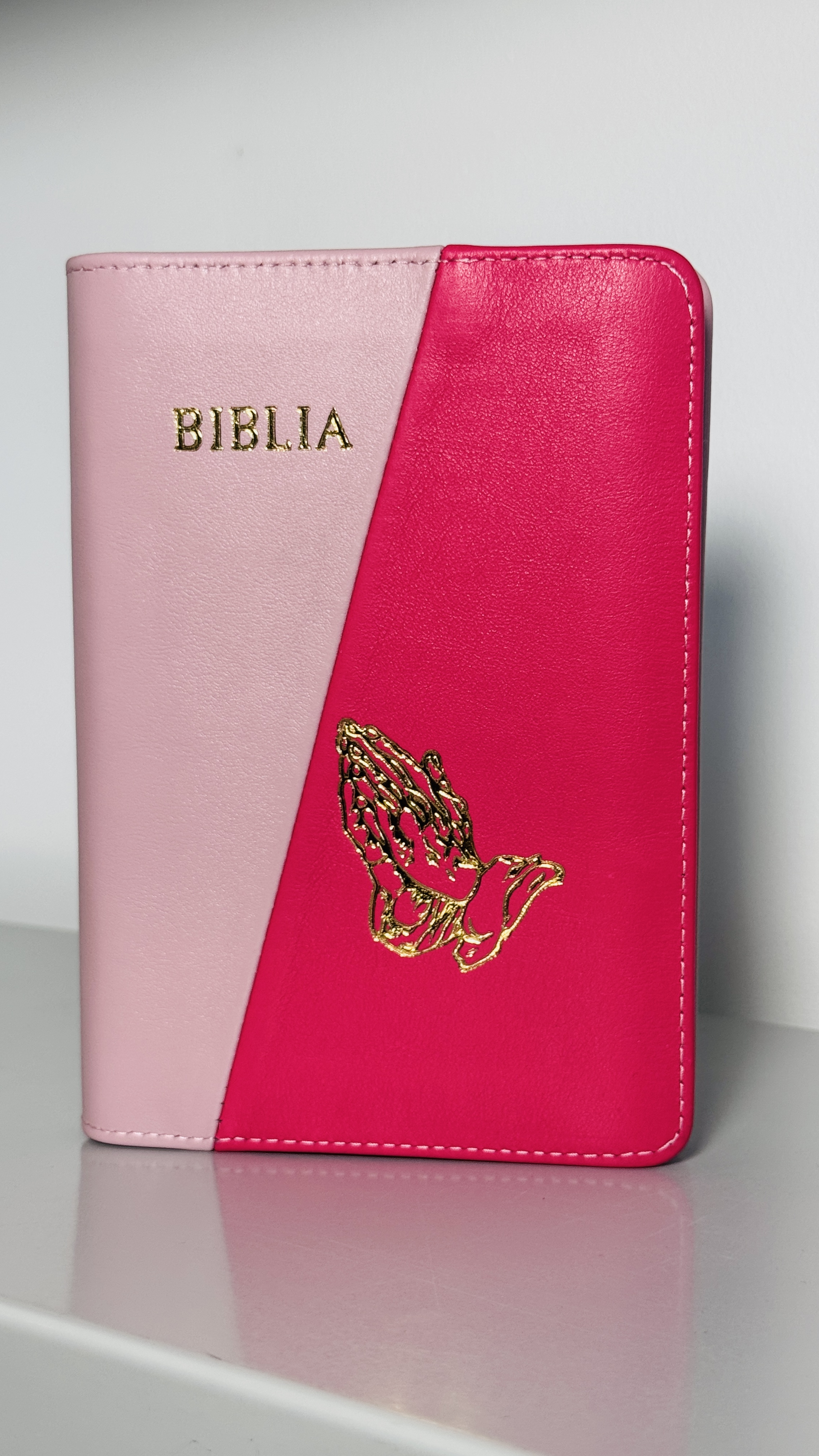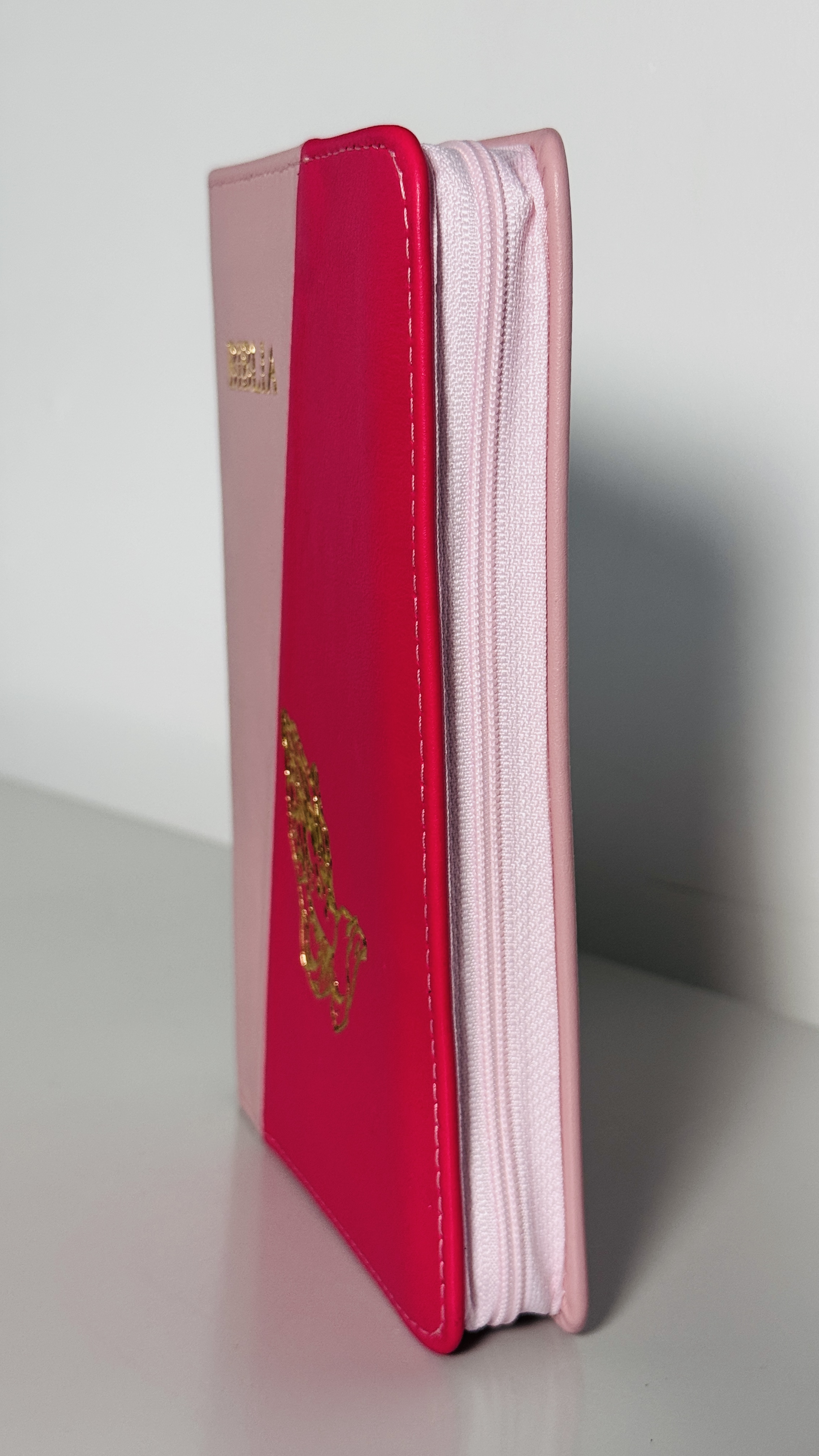 Biblie din piele, marime medie, roz deschis cu roz bombon, fermoar, index, margini aurii, maini in ruga [SB 057 PFI]