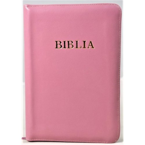 Biblie din piele, marime medie, roz incarnat, fermoar, index, margini aurii, cuv. lui Isus cu rosu [SB 057 PFI]