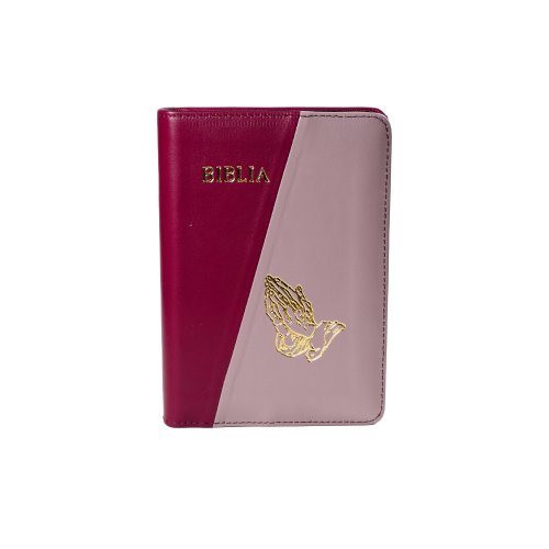Biblie din piele, marime medie, roz magenta închis cu mov , simbol maini in rugaciune, fermoar, index, margini aurii, cuv. lui Isus cu rosu [SB 057 PFI]