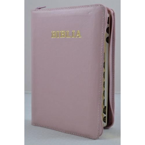 Biblie din piele, marime medie,roz pal, fermoar, index, margini aurii, cuv. lui Isus cu rosu [SB 057 PFI]