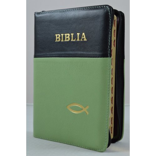 Biblie din piele, marime medie, verde cu negru, simbol peste, fermoar, index, margini aurii, cuv. lui Isus cu rosu [SB 057 PFI]