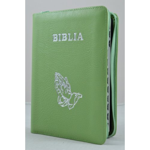 Biblie din piele, marime medie, verde deschis, simbol maini in ruga, fermoar, index, margini argintii, cuv. lui Isus cu rosu [SB 057 PFI]