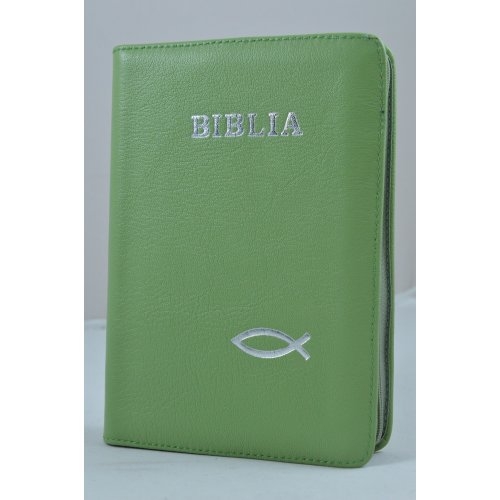 Biblie din piele, marime medie, verde vernil, simbol peste, fermoar, index, margini aurii, cuv. lui Isus cu rosu [SB 057 PFI]