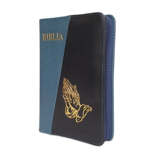 Biblie din piele,marime mica, culoare albastru mineral cu negru, fermoar, margini albe, simbolul maini in rugaciune, cuv. lui Isus in rosu [043 PF]